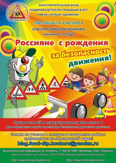 Благотворительный фонд поддержки детей пострадавших в ДТП имени «Наташи Едыкиной» приглашает принять участие в III-ем Всероссийском конкурсе рисунков по ПДД «Россияне с рождения за безопасность движения!»